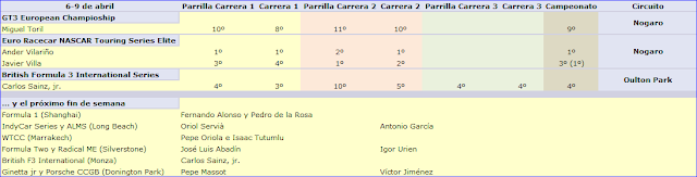 Este fin de semana, y al otro lado del Atlántico, se disputan la cuarta prueba de las IndyCar Series en Saõ Paulo, con Oriol Servià, y la tercera de la Grand Am en Miami, con Antonio García. Las GP2 Series repiten en el circuito de Bahréin, donde volverá a estar Dani Clos. En Slovakia Ring se disputarán la cuarta prueba del mundial de turismos (WTCC), donde esta vez sólo contaremos con Pepe Oriola, y la segunda cita de la copa europea de turismos (ETCC), donde Fernando Monje defenderá su liderato.